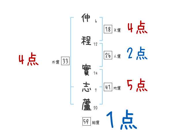 地運![]() | 仲程實志蘆さんの地運は41画の5つ星!大志を抱き、目標に向かって実力を発揮し達成する。温和な性格。 個性を表す基礎的な運勢です。性格形成や対人関係、行動力など家庭環境に影響されます。主に誕生してから20歳くらいまでの若年期の運勢を表します。 |