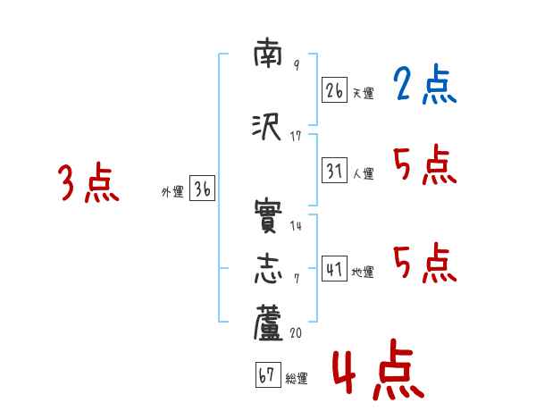 外運![]() | 南沢實志蘆さんの外運は36画の3つ星!先見性が豊かです。多少神経質で苦労することも。 生活面を象徴する運勢です。外部から受ける影響力を表し、結婚運、家庭運や職場、環境への順応性を表します。 |