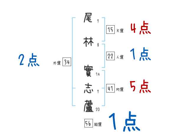 外運![]() | 尾林實志蘆さんの外運は34画の2つ星!独創性に優れるが、自尊心が強く災難に注意しましょう。 生活面を象徴する運勢です。外部から受ける影響力を表し、結婚運、家庭運や職場、環境への順応性を表します。 |