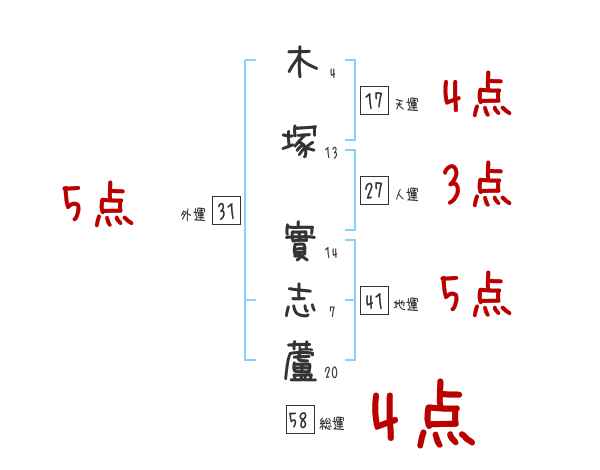 天運![]() | 木塚實志蘆さんの天運は17画の4つ星!積極的な行動力。地位を気づき財産を手に入れる。純粋な心と直感力。 家系が持つ宿命的な運勢を表します。祖先から受け継いだ苗字ですので自分の力が及びません。家柄を象徴します。 |