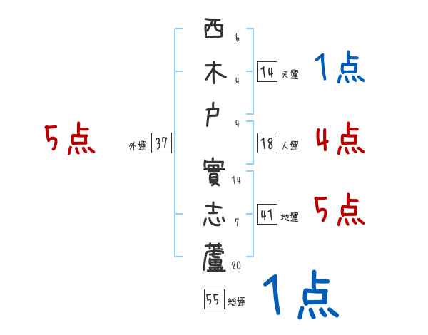 外運![]() | 西木戸實志蘆さんの外運は37画の5つ星!努力家で順応性に優れる。現実的な考え方ができ忠実に物事をこなす。 生活面を象徴する運勢です。外部から受ける影響力を表し、結婚運、家庭運や職場、環境への順応性を表します。 |