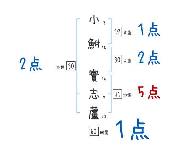 外運![]() | 小鮒實志蘆さんの外運は30画の2つ星!浮き沈みの激しさに注意しましょう。 生活面を象徴する運勢です。外部から受ける影響力を表し、結婚運、家庭運や職場、環境への順応性を表します。 |