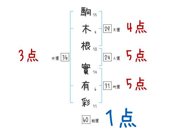 駒木根實有彩さんの外運は36画の3つ星