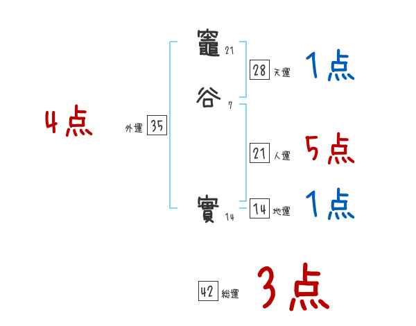 外運![]() | 竈谷實さんの外運は35画の4つ星!温厚な性格で感受性が高い。穏和な性格で人望が厚い。 生活面を象徴する運勢です。外部から受ける影響力を表し、結婚運、家庭運や職場、環境への順応性を表します。 |