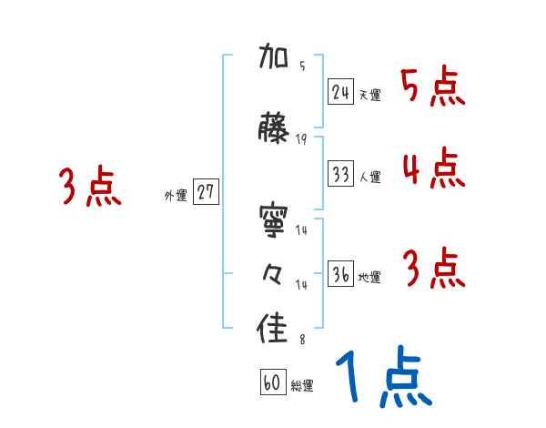 天運![]() | 加藤寧々佳さんの天運は24画の5つ星!家庭運が良く順調な人生。金運にも恵まれる。 家系が持つ宿命的な運勢を表します。祖先から受け継いだ苗字ですので自分の力が及びません。家柄を象徴します。 |