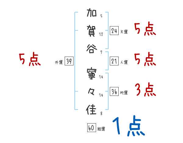 外運![]() | 加賀谷寧々佳さんの外運は39画の5つ星!社交性に優れ人望が厚い。人の上に立ち成功する。 生活面を象徴する運勢です。外部から受ける影響力を表し、結婚運、家庭運や職場、環境への順応性を表します。 |