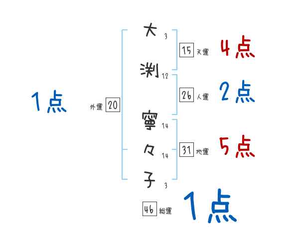 総運![]() | 大渕寧々子さんの総運は46画の1つ星!迷走することが多く苦労するかも。目先のことにとらわれないように。 あなたの人生を表す1番重要な運勢です。生涯を通じて影響する総合運となり、主に50歳以降の晩年期に影響を及ぼします。 |