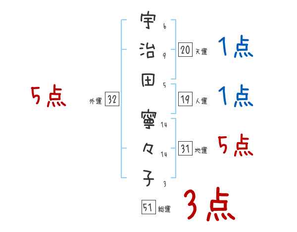 外運![]() | 宇治田寧々子さんの外運は32画の5つ星!柔軟性があり成功する。チャンスが多く金運が良い。 生活面を象徴する運勢です。外部から受ける影響力を表し、結婚運、家庭運や職場、環境への順応性を表します。 |