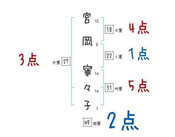 天運![]() | 宮岡寧々子さんの天運は18画の4つ星!情熱的で剛気。忍耐力があり信頼される。 家系が持つ宿命的な運勢を表します。祖先から受け継いだ苗字ですので自分の力が及びません。家柄を象徴します。 |