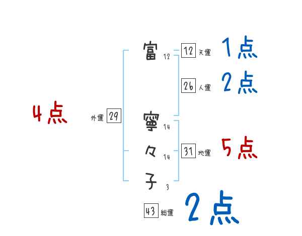 外運![]() | 富寧々子さんの外運は29画の4つ星!完全主義で才能がある。厳格な心の持ち主。 生活面を象徴する運勢です。外部から受ける影響力を表し、結婚運、家庭運や職場、環境への順応性を表します。 |