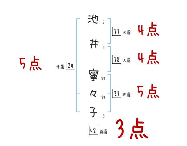 外運![]() | 池井寧々子さんの外運は24画の5つ星!家庭運が良く順調な人生。金運にも恵まれる。 生活面を象徴する運勢です。外部から受ける影響力を表し、結婚運、家庭運や職場、環境への順応性を表します。 |