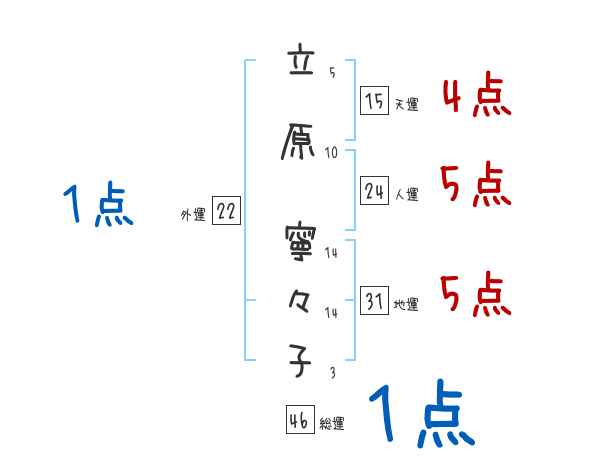 総運![]() | 立原寧々子さんの総運は46画の1つ星!迷走することが多く苦労するかも。目先のことにとらわれないように。 あなたの人生を表す1番重要な運勢です。生涯を通じて影響する総合運となり、主に50歳以降の晩年期に影響を及ぼします。 |