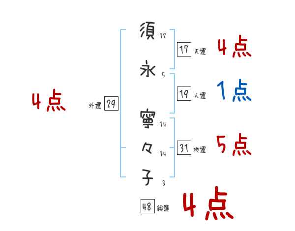 | 総運  | 須永寧々子さんの総運は48画の4つ星!賢明な性格で人望が厚い。指導力があり多くの人に尊敬される。あなたの人生を表す1番重要な運勢です。生涯を通じて影響する総合運となり、主に50歳以降の晩年期に影響を及ぼします。 |