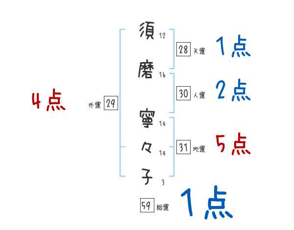 天運![]() | 須磨寧々子さんの天運は28画の1つ星!家庭環境に注意。スポーツで活躍できる能力があるかも。 家系が持つ宿命的な運勢を表します。祖先から受け継いだ苗字ですので自分の力が及びません。家柄を象徴します。 |