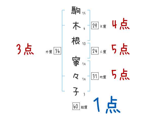 総運![]() | 駒木根寧々子さんの総運は60画の1つ星!悲観的で迷いやすい。波乱が多く損をしないように。 あなたの人生を表す1番重要な運勢です。生涯を通じて影響する総合運となり、主に50歳以降の晩年期に影響を及ぼします。 |
