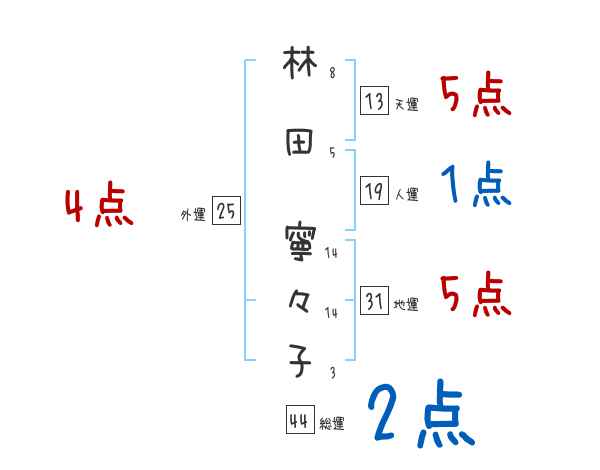 総運![]() | 林田寧々子さんの総運は44画の2つ星!誠実で慎重な性格。物事を考えすぎないように注意しましょう。 あなたの人生を表す1番重要な運勢です。生涯を通じて影響する総合運となり、主に50歳以降の晩年期に影響を及ぼします。 |