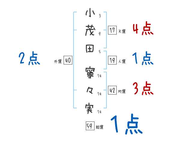 外運![]() | 小茂田寧々実さんの外運は40画の2つ星!自信過剰で物事に固執するためトラブルに注意。 生活面を象徴する運勢です。外部から受ける影響力を表し、結婚運、家庭運や職場、環境への順応性を表します。 |