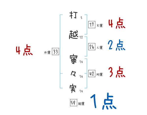 外運![]() | 打越寧々実さんの外運は33画の4つ星!権力志向でプライドが高い。勇気があり運を切り開き成功する。 生活面を象徴する運勢です。外部から受ける影響力を表し、結婚運、家庭運や職場、環境への順応性を表します。 |