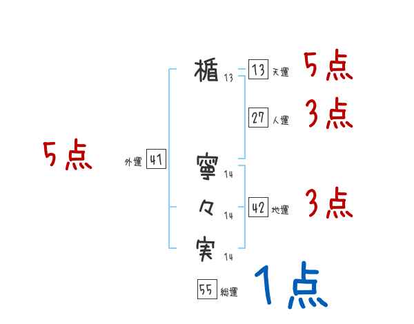 外運![]() | 楯寧々実さんの外運は41画の5つ星!大志を抱き、目標に向かって実力を発揮し達成する。温和な性格。 生活面を象徴する運勢です。外部から受ける影響力を表し、結婚運、家庭運や職場、環境への順応性を表します。 |