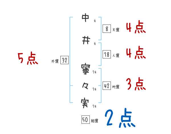 外運![]() | 中井寧々実さんの外運は32画の5つ星!柔軟性があり成功する。チャンスが多く金運が良い。 生活面を象徴する運勢です。外部から受ける影響力を表し、結婚運、家庭運や職場、環境への順応性を表します。 |