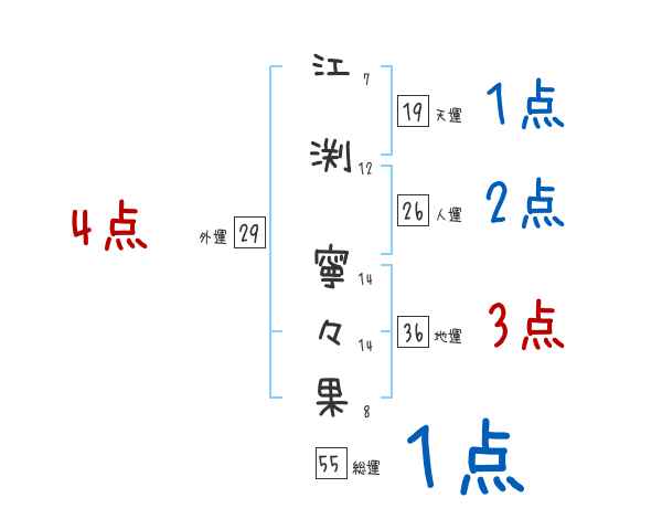外運![]() | 江渕寧々果さんの外運は29画の4つ星!完全主義で才能がある。厳格な心の持ち主。 生活面を象徴する運勢です。外部から受ける影響力を表し、結婚運、家庭運や職場、環境への順応性を表します。 |