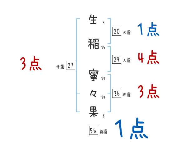 外運![]() | 生稲寧々果さんの外運は27画の3つ星!頭脳明晰だが強情で摩擦が多い傾向。孤立に注意。 生活面を象徴する運勢です。外部から受ける影響力を表し、結婚運、家庭運や職場、環境への順応性を表します。 |