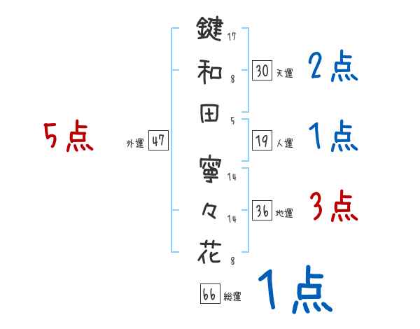 外運![]() | 鍵和田寧々花さんの外運は47画の5つ星!実力が開花し発展する円満な人生。財に恵まれる。 生活面を象徴する運勢です。外部から受ける影響力を表し、結婚運、家庭運や職場、環境への順応性を表します。 |