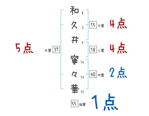 総運![]() | 和久井寧々華さんの総運は55画の1つ星!欲張りな性格で軽率な行動に注意しましょう。病気に気をつけて。 あなたの人生を表す1番重要な運勢です。生涯を通じて影響する総合運となり、主に50歳以降の晩年期に影響を及ぼします。 |