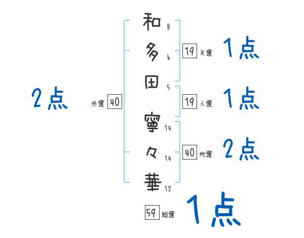 外運![]() | 和多田寧々華さんの外運は40画の2つ星!自信過剰で物事に固執するためトラブルに注意。 生活面を象徴する運勢です。外部から受ける影響力を表し、結婚運、家庭運や職場、環境への順応性を表します。 |