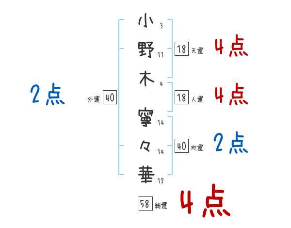 人運![]() | 小野木寧々華さんの人運は18画の4つ星!情熱的で剛気。忍耐力があり信頼される。 性格や才能などを表す2番目に重要な運勢です。人間関係や協調性、社会的な成功に影響します。主に20歳から50歳ぐらいまでの中年期の運勢を表します。 |