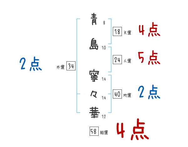 天運![]() | 青島寧々華さんの天運は18画の4つ星!情熱的で剛気。忍耐力があり信頼される。 家系が持つ宿命的な運勢を表します。祖先から受け継いだ苗字ですので自分の力が及びません。家柄を象徴します。 |