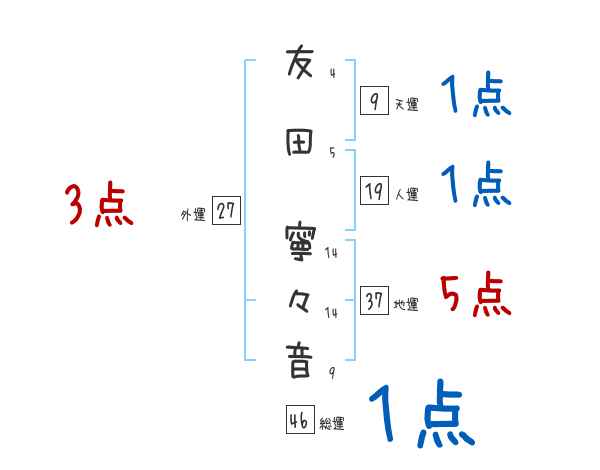 天運![]() | 友田寧々音さんの天運は9画の1つ星!消極的で才能を発揮することが苦手なことも。周りの意見に耳を傾けましょう。 家系が持つ宿命的な運勢を表します。祖先から受け継いだ苗字ですので自分の力が及びません。家柄を象徴します。 |