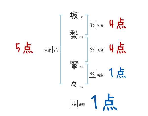 総運![]() | 坂梨寧々さんの総運は46画の1つ星!迷走することが多く苦労するかも。目先のことにとらわれないように。 あなたの人生を表す1番重要な運勢です。生涯を通じて影響する総合運となり、主に50歳以降の晩年期に影響を及ぼします。 |