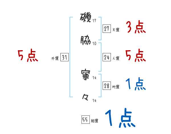 天運![]() | 磯脇寧々さんの天運は27画の3つ星!頭脳明晰だが強情で摩擦が多い傾向。孤立に注意。 家系が持つ宿命的な運勢を表します。祖先から受け継いだ苗字ですので自分の力が及びません。家柄を象徴します。 |