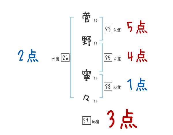 外運![]() | 菅野寧々さんの外運は26画の2つ星!波瀾万丈かも。信頼できる人を大事にしましょう。 生活面を象徴する運勢です。外部から受ける影響力を表し、結婚運、家庭運や職場、環境への順応性を表します。 |