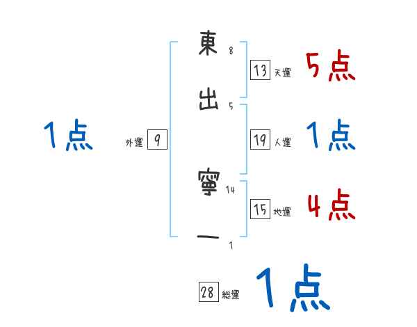外運![]() | 東出寧一さんの外運は9画の1つ星!消極的で才能を発揮することが苦手なことも。周りの意見に耳を傾けましょう。 生活面を象徴する運勢です。外部から受ける影響力を表し、結婚運、家庭運や職場、環境への順応性を表します。 |