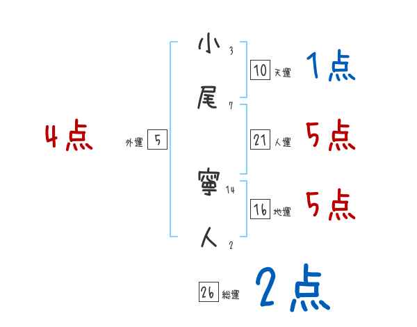 外運![]() | 小尾寧人さんの外運は5画の4つ星!健康で安泰。協調性に優れ、財産に恵まれる。 生活面を象徴する運勢です。外部から受ける影響力を表し、結婚運、家庭運や職場、環境への順応性を表します。 |
