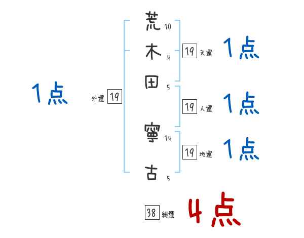 天運![]() | 荒木田寧古さんの天運は19画の1つ星!優れた才能を持ちますが、協調性が足りないことも。周りの人と協力する事を意識しましょう。 家系が持つ宿命的な運勢を表します。祖先から受け継いだ苗字ですので自分の力が及びません。家柄を象徴します。 |
