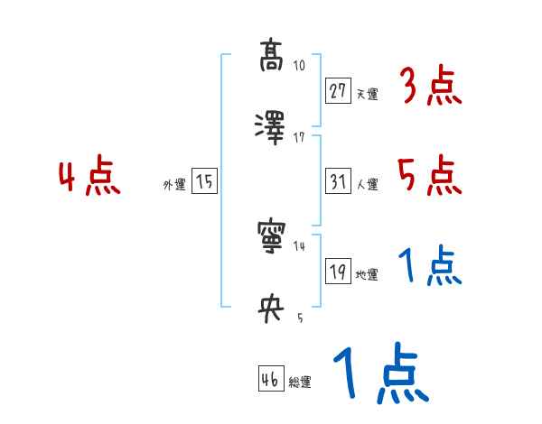 天運![]() | 髙澤寧央さんの天運は27画の3つ星!頭脳明晰だが強情で摩擦が多い傾向。孤立に注意。 家系が持つ宿命的な運勢を表します。祖先から受け継いだ苗字ですので自分の力が及びません。家柄を象徴します。 |