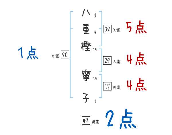 天運![]() | 八重樫寧子さんの天運は32画の5つ星!柔軟性があり成功する。チャンスが多く金運が良い。 家系が持つ宿命的な運勢を表します。祖先から受け継いだ苗字ですので自分の力が及びません。家柄を象徴します。 |