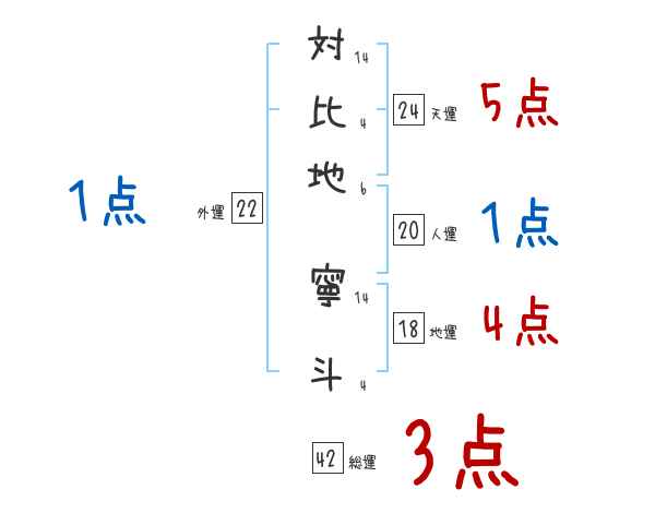 総運![]() | 対比地寧斗さんの総運は42画の3つ星!病気に注意。多芸であるが消極的でおとなしい。 あなたの人生を表す1番重要な運勢です。生涯を通じて影響する総合運となり、主に50歳以降の晩年期に影響を及ぼします。 |