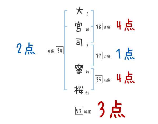 外運![]() | 大宮司寧桜さんの外運は34画の2つ星!独創性に優れるが、自尊心が強く災難に注意しましょう。 生活面を象徴する運勢です。外部から受ける影響力を表し、結婚運、家庭運や職場、環境への順応性を表します。 |