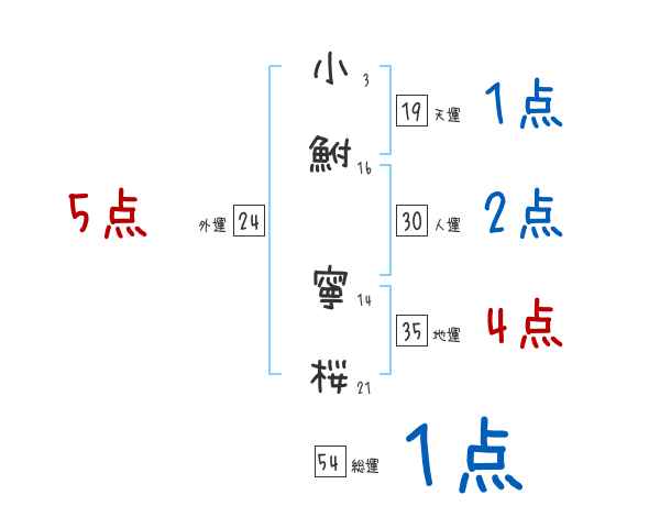 総運![]() | 小鮒寧桜さんの総運は54画の1つ星!トラブルが多いかも。周りをよく見て協調して過ごしましょう。 あなたの人生を表す1番重要な運勢です。生涯を通じて影響する総合運となり、主に50歳以降の晩年期に影響を及ぼします。 |