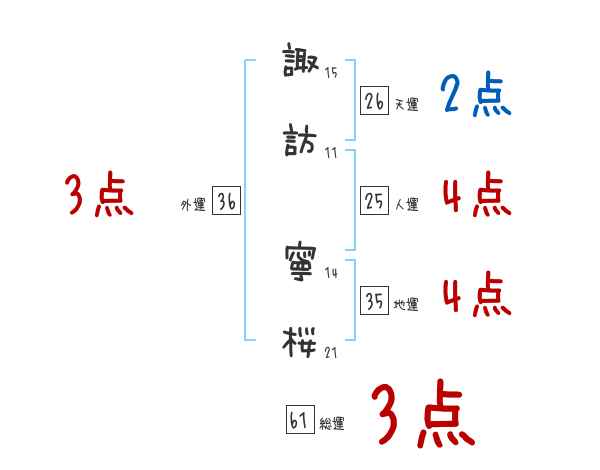 外運![]() | 諏訪寧桜さんの外運は36画の3つ星!先見性が豊かです。多少神経質で苦労することも。 生活面を象徴する運勢です。外部から受ける影響力を表し、結婚運、家庭運や職場、環境への順応性を表します。 |
