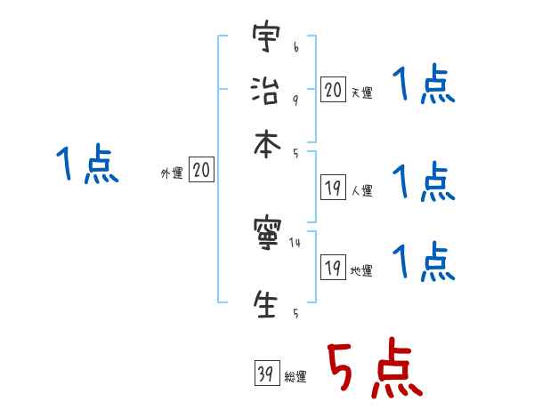人運![]() | 宇治本寧生さんの人運は19画の1つ星!優れた才能を持ちますが、協調性が足りないことも。周りの人と協力する事を意識しましょう。 性格や才能などを表す2番目に重要な運勢です。人間関係や協調性、社会的な成功に影響します。主に20歳から50歳ぐらいまでの中年期の運勢を表します。 |