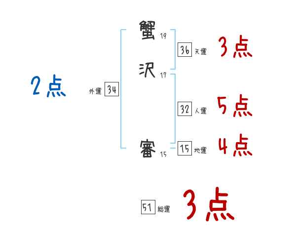 外運![]() | 蟹沢審さんの外運は34画の2つ星!独創性に優れるが、自尊心が強く災難に注意しましょう。 生活面を象徴する運勢です。外部から受ける影響力を表し、結婚運、家庭運や職場、環境への順応性を表します。 |