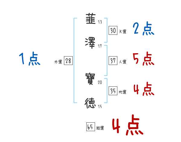 天運![]() | 韮澤寶徳さんの天運は30画の2つ星!浮き沈みの激しさに注意しましょう。 家系が持つ宿命的な運勢を表します。祖先から受け継いだ苗字ですので自分の力が及びません。家柄を象徴します。 |