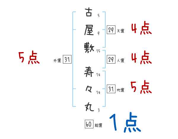 天運![]() | 古屋敷寿々丸さんの天運は29画の4つ星!完全主義で才能がある。厳格な心の持ち主。 家系が持つ宿命的な運勢を表します。祖先から受け継いだ苗字ですので自分の力が及びません。家柄を象徴します。 |