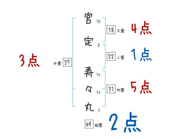 天運![]() | 宮定寿々丸さんの天運は18画の4つ星!情熱的で剛気。忍耐力があり信頼される。 家系が持つ宿命的な運勢を表します。祖先から受け継いだ苗字ですので自分の力が及びません。家柄を象徴します。 |