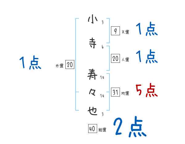 天運![]() | 小寺寿々也さんの天運は9画の1つ星!消極的で才能を発揮することが苦手なことも。周りの意見に耳を傾けましょう。 家系が持つ宿命的な運勢を表します。祖先から受け継いだ苗字ですので自分の力が及びません。家柄を象徴します。 |